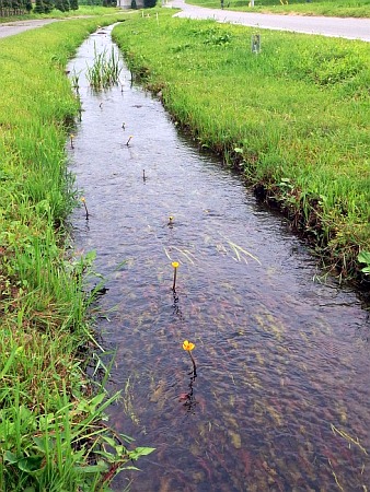 下小代駅から県道70号線に出て、最初に右折する交差点に案内看板がある。世界で栃木県の数か所にしか見つかっていない、国の絶滅危惧種AIランク。水面から上に葉が出ないコウホネ。花が見られるのは夏から秋にかけて。小川にはトウキョウダルマガエルが多数棲息している。