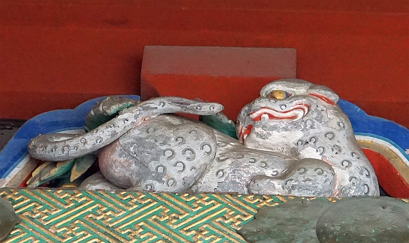 家康の生まれ年の干支が寅だったことから、東照宮内にはたくさんの虎の彫刻があります。表門長押の蛙股(Ωのような形の部分)にもいますね。で、その中のこれ↓も実は虎なのです。白い豹に見えるかもしれませんが、当時の日本では虎も豹も見た人はおらず、斑点のあるこの生き物は「雌の虎」だと思われていました。なのでこれは「豹と虎」ではなく「雌雄の虎」なのです。