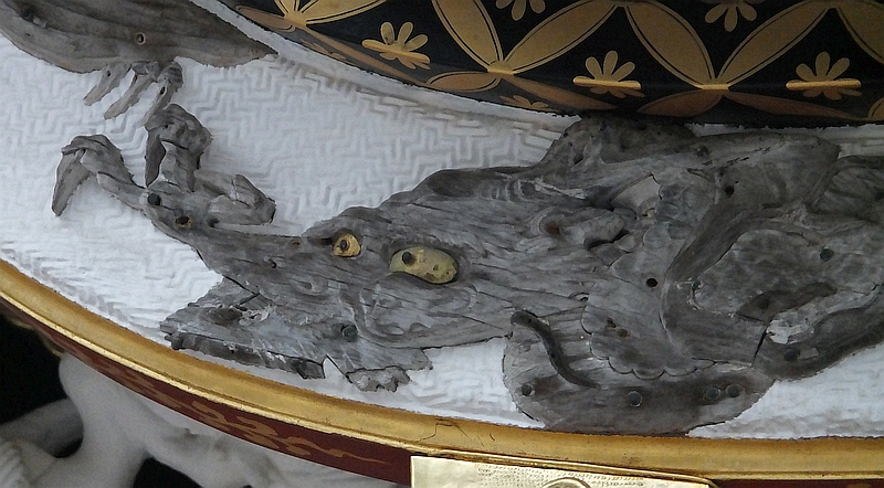 胡粉(貝の殻を砕いて粉にしたもの)塗りの白と漆の黒を基調にして、龍などもデフォルメされてかっこいいですね。