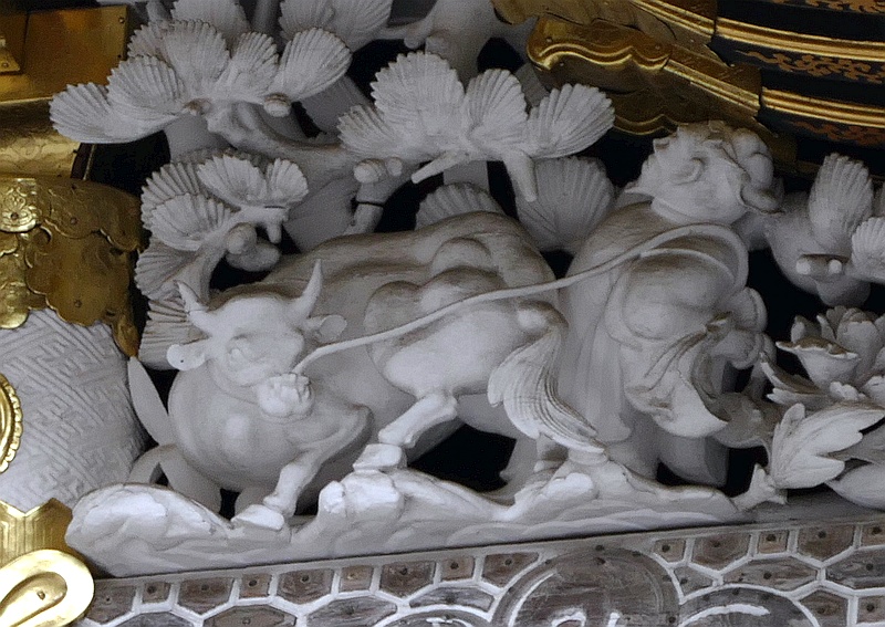 動物絡みでひとつ紹介すると、唐破風(からはぶ)にある「許由(きょゆう)巣父(そうほ)図」の右側(巣父のほう)に牛が描かれています。